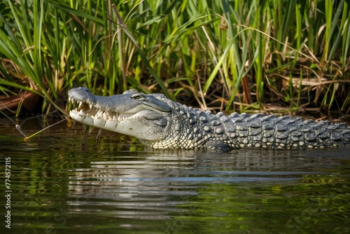 Crocodile in river, natural habitat, reptile in water