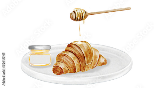 Croissant on a white plate watercolor illustration. Hand drawn fresh french bun with honey stick and drops. Food clip art. Ideal for bakery prints, postcards and pastry shop posters.