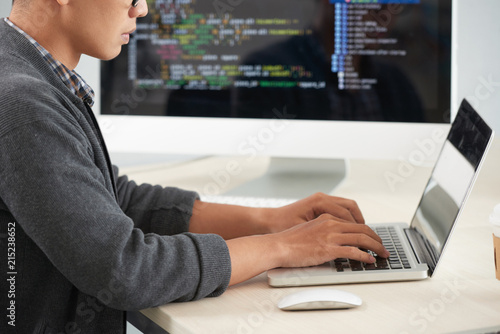 Crop side view of man in casual clothes sitting at workplace and typing on laptop keyboard with computer monitor with source code nearby on blurred background .