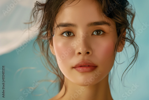 Cropped beautiful female Asian beauty care models face front close up. Calm relaxed young Korean woman with soft clean perfect skin looking at camera.