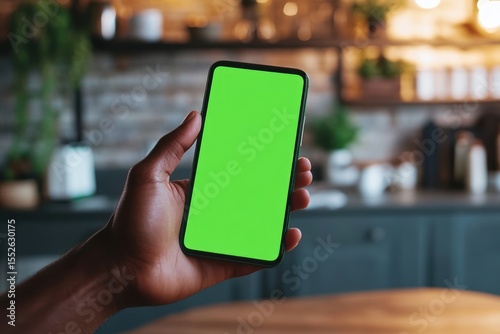 Cropped hand of African-American male tapping green screen mobile phone, cozy kitchen backdrop