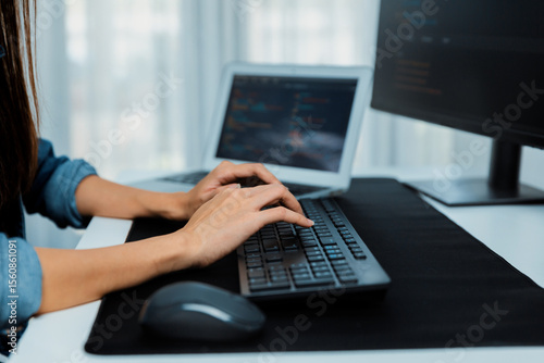 Cropped hands image of IT developer creating with typing information on pc with coding program information data website application, wearing jeans shirt surround safety analysis two screen. Stratagem.