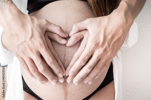 cropped hand's pregnant woman and her husband put on beautiful tummy