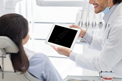 Cropped image of dentist showing patient blank digital tablet screen, modern technologies in stomatology, empty space