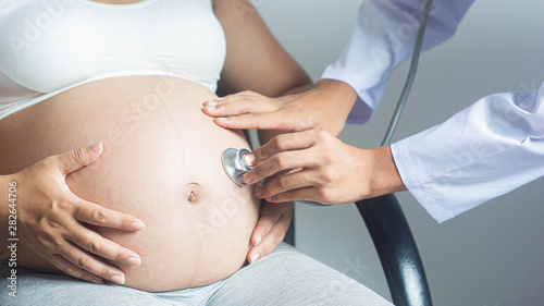 Cropped image of doctor using stethoscope white examining pregnant woman in clinic.Medical exam concept,
