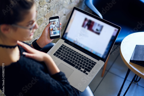 Cropped image of female holding digital cellular in hand with blank screen area while sitting indoors with modern laptop computer connecting to high speed 4G internet.Mock up space for advertising