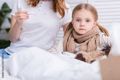 cropped image of mother taking care of sick daughter in bedroom and checking her temperature with thermometer