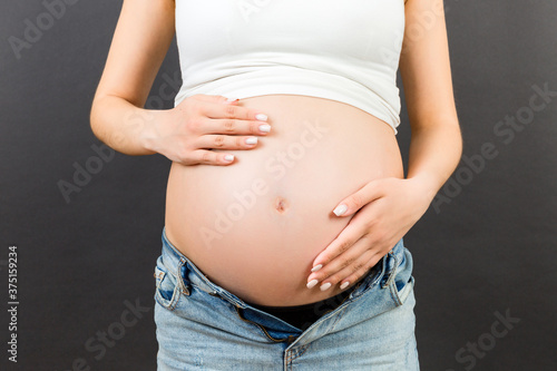 Cropped image of pregnant belly at colorful background with copy space. Expecting mother in opened jeans. Motherhood concept