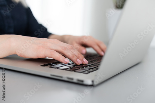 Cropped image of professional businesswoman working at her office via laptop, young female manager using portable computer device while sitting at modern loft, flare light, work process concept