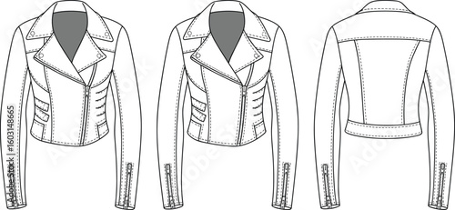 Cropped leather jacket front and back illustration, detailed stitching, zippered pockets, stylish fashion sketch template for modern apparel design