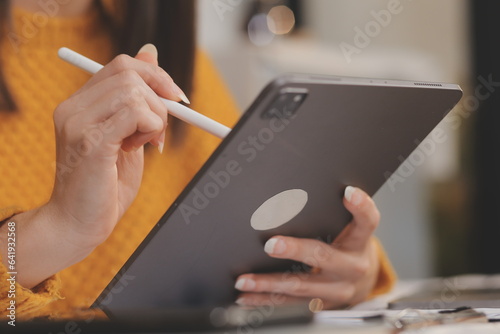 Cropped photo of Freelancer business Asian woman holding coffee cup and at doing planning analyzing the financial report, business plan investment, finance analysis the workplace.