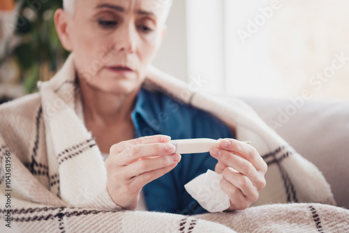 Cropped photo of nice aged lady hold thermometer wear blue shirt bright interior apartment indoors