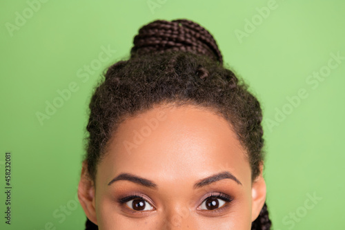 Cropped photo of young afro american happy woman face eyes good mood isolated on green color background