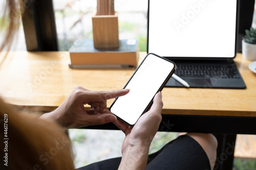 Cropped shot female sitting in cafe and using mobile phone.