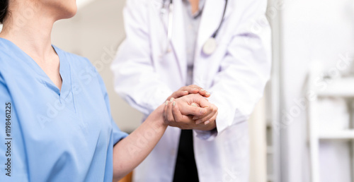 Cropped shot of a female nurse hold her senior patient's hand. Giving Support. Doctor helping old patient with Alzheimer's disease