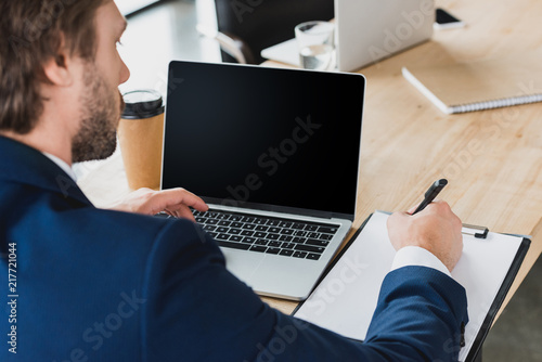 cropped shot of businessman taking notes on clipboard and using laptop with blank screen at workplace