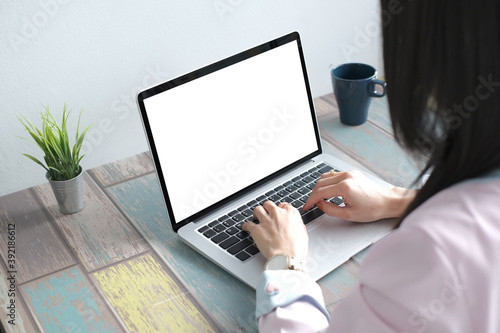 Cropped shot of businesswoman is working on computer with isolated white display for your advertising text message.