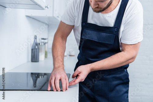 cropped shot of handyman in working overall fixing oven in kitchen