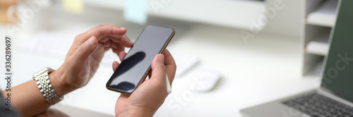 Cropped shot of male entrepreneur using smartphone while sitting at minimal workspace