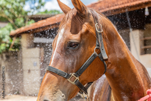 Cropped shot of person washing brown purebred horse outdoors