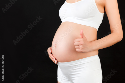 Cropped shot of positive pregnant woman in white underwear showing thumb up cool gesture over her baby bump at black background. Happy maternity. Copy space