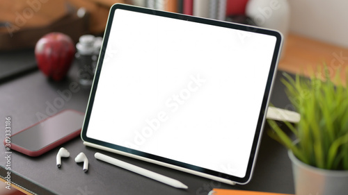 Cropped shot of stylish workplace with blank screen digital tablet and office supplies on black table