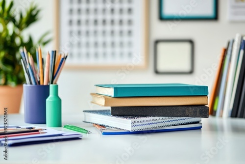Cropped shot of trendy workspace with books, designer supplies and copy space on white table , ai