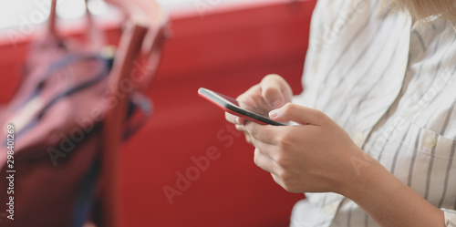Cropped shot of young businesswoman holding smartphone while working on her project
