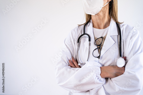 Cropped unrecognizable female doctor in white uniform and stethoscope wearing protective medical mask standing with arms crossed