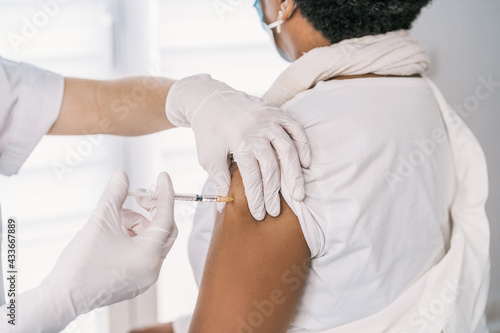 Cropped unrecognizable female medical specialist in protective uniform, latex gloves and face mask vaccinating anonymous African American mature woman patient in clinic during coronavirus outbreak