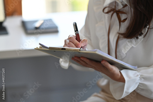 Cropped view businesswoman sitting in the office holding a report and writing something, for business and finance concept.