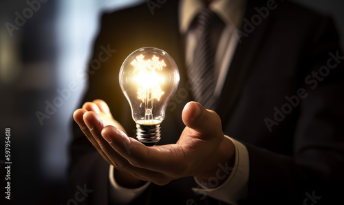 Cropped view of a businessman holding a lit light bulb. New ideas, brain work concept. Generative AI.