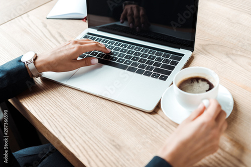 cropped view of businesswoman typing on laptop with blank screen near cup of coffee on table