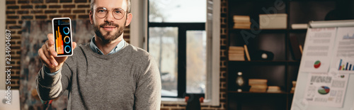 cropped view of casual businessman holding smartphone with graph on screen in loft office
