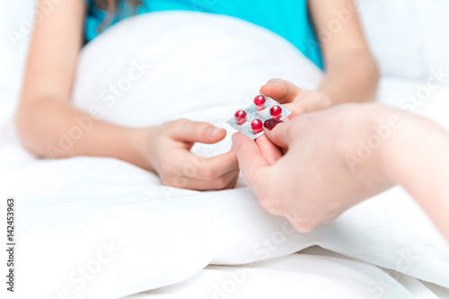 cropped view of doctor giving pills to little patient lying on bed