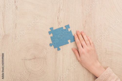 cropped view of female hand near blue puzzles on wooden table