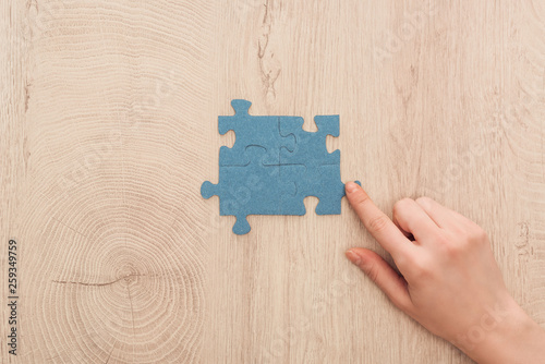 cropped view of female hand pointing with finger at blue puzzle pieces connected on wooden table