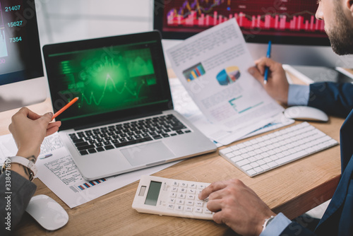 Cropped view of information security analysts using calculator and graphs on computer monitors while working in office