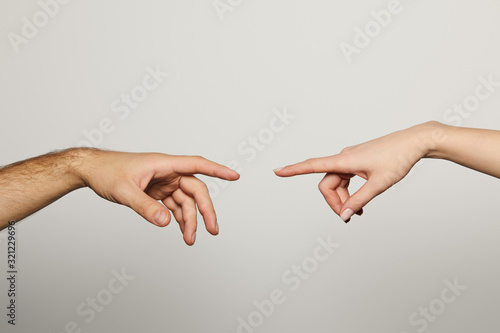 cropped view of man and woman reaching for each other isolated on white