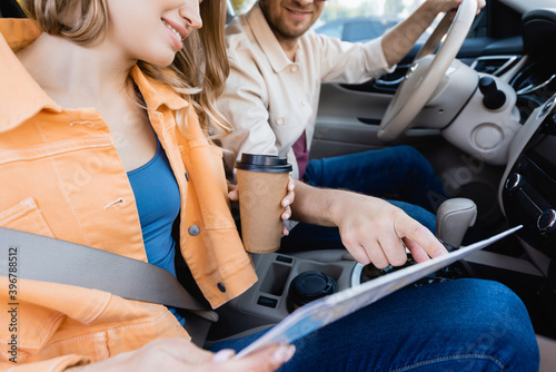 Cropped view of man pointing at map near smiling wife with coffee to go in car