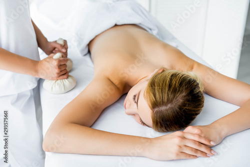 cropped view of masseur doing back massage with herbal balls to woman in spa