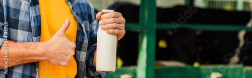 cropped view of rancher holding bottle of fresh milk and showing thumb up, horizontal image