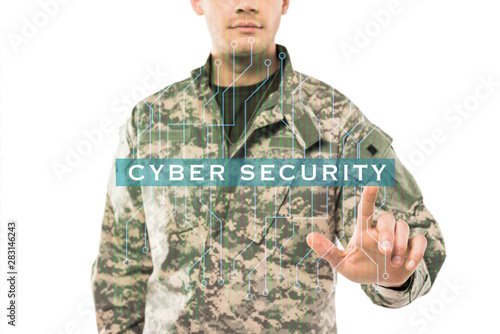 Cropped view of soldier in uniform pointing with finger at cyber security lettering on white