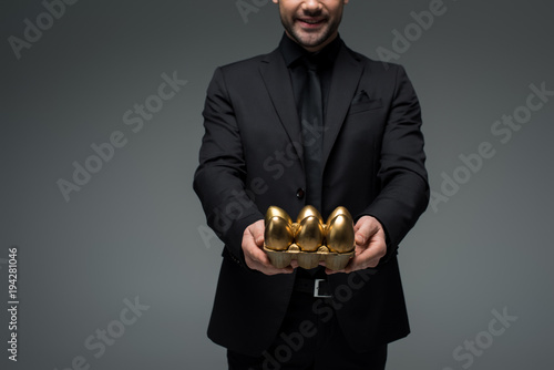 Cropped view of stylish man with golden eggs isolated on grey, easter concept
