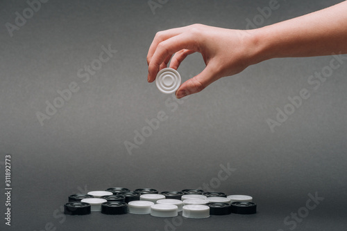 Cropped view of woman holding white checker isolated on grey