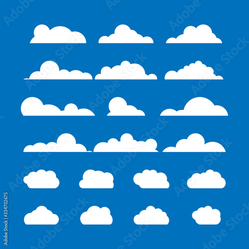 Cropped White Clouds. Set of cropped white clouds of different shapes on blue background in the form of the sky. Flat. Vector illustration