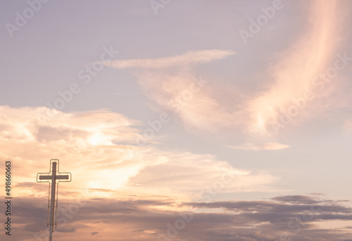 cross and heavenly colorful clouds sky in dawn Easter morning. glory light on the cloud. holiness covered high above love and hope in the air. wide space in atmosphere.