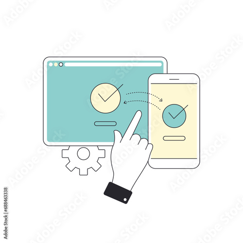 Cross device syncing, cross device tracking and cross platform software with simple line illustration concept