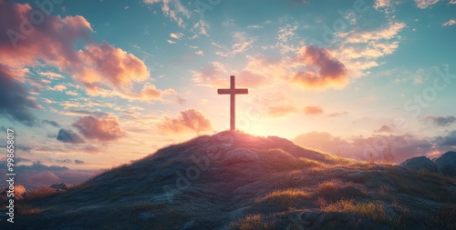 Cross on a hilltop against a stunning sky, embodying an Easter theme.