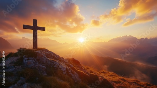 Cross on mountain peak at sunrise with vibrant clouds illuminating the sky